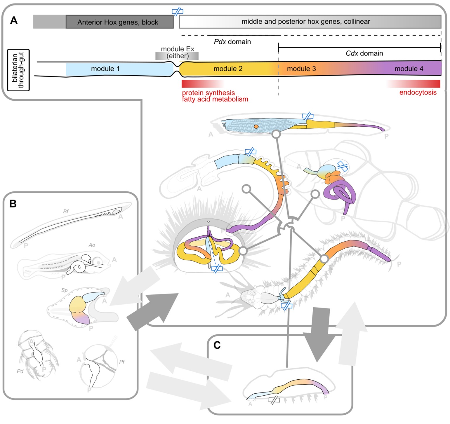 A through-gut is one of the major features of most animals that is established during early development by common gut patterning systems along its anterior posterior (AP) axis. A collaboration of four research groups at Institute of Cellular and Organismic Biology, Academia Sinica, discovered that these AP gut patterning systems comprising of various transcription factors like Hox and Parahox appear to be deployed not only in embryonic/larval guts but also in fully differentiated adult guts in animals that exhibit bilateral symmetry (bilateria) like annelid worms, sea urchins, and vertebrates like us. This is surprising especially in animals that are extensively rebuilding their gut after metamorphosis like the sea urchin. Thus, our study identified conserved and modified adult AP patterning modules along the adult bilaterian gut, an observation with profound implications for the evolution of the bilaterian body plan.