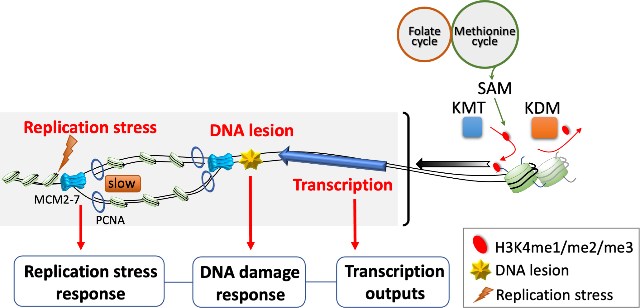 Caption : H3K4me is involved in a variety of mechanisms affecting nuclear functions. The epigenetic mark is thought to promote gene transcription, and there is an increasing body of evidence showing that H3K4me is also involved in various other nuclear functions, such as origin firing, replication stress, and DNA damage responses.