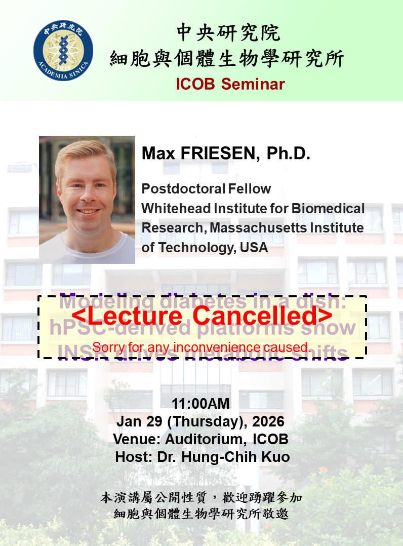 - Title:《POSTPONED》[ICOB Seminar] Modeling diabetes in a dish: hPSC-derived platforms show INSR drives metabolic shifts