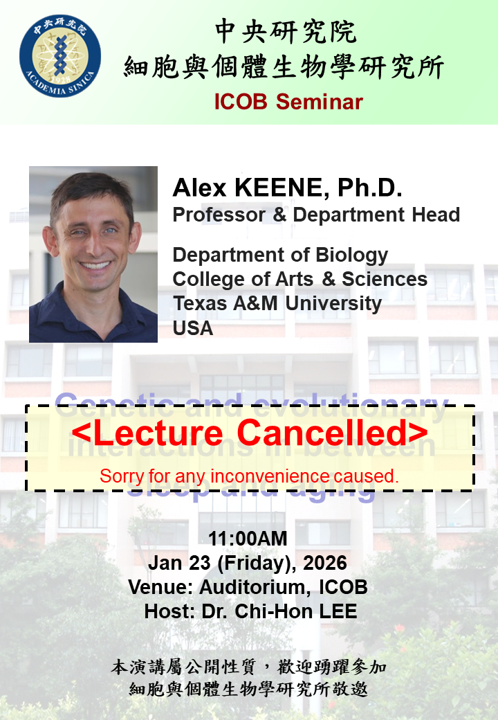 - Title:《Cancelled》[ICOB Seminar] Genetic and evolutionary interactions in between sleep and aging