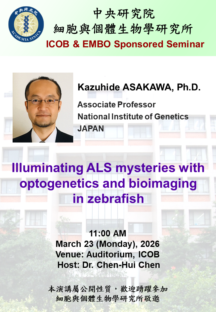 - Title:[ICOB & EMBO Sponsored Seminar] Illuminating ALS mysteries with optogenetics and bioimaging in zebrafish