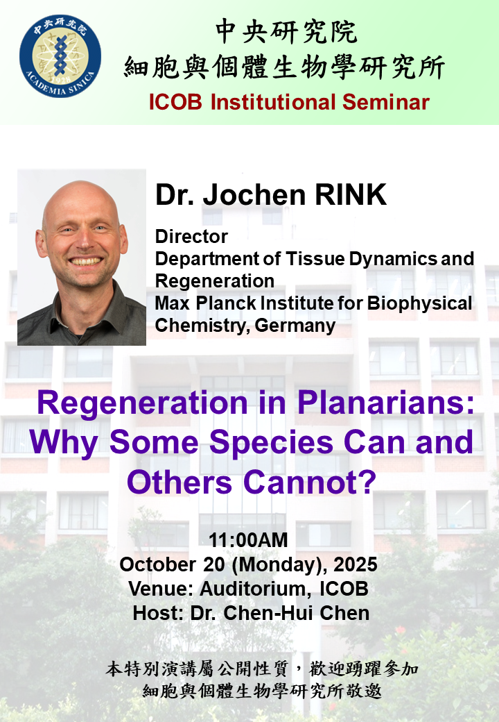 - Title:[ICOB Institutional Seminar] Regeneration in Planarians: Why Some Species Can and Others Cannot?