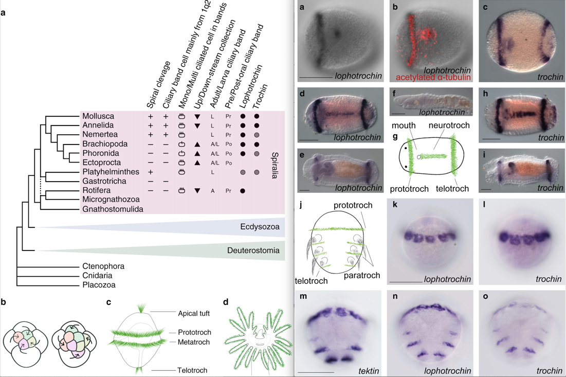 Spiralia is a large, ancient and diverse clade of animals, with a conserved early developmental program but diverse larval and adult morphologies. One trait shared by many spiralians is the presence of ciliary bands used for locomotion and feeding. To learn more about spiralian-specific traits we have examined the expression of 20 genes with protein motifs that are strongly conserved within the Spiralia, but not detectable outside of it. Here, we show that two of these are specifically expressed in the main ciliary band of the mollusc Tritia (also known as Ilyanassa). Their expression patterns in representative species from five more spiralian phyla—the annelids, nemerteans, phoronids, brachiopods and rotifers—show that at least one of these, lophotrochin, has a conserved and specific role in particular ciliated structures, most consistently in ciliary bands. These results highlight the potential importance of lineage-specific genes or protein motifs for understanding traits shared across ancient lineages.