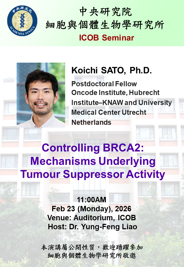 - 講 題:[細生所演講] Controlling BRCA2: Mechanisms Underlying Tumour Suppressor Activity
